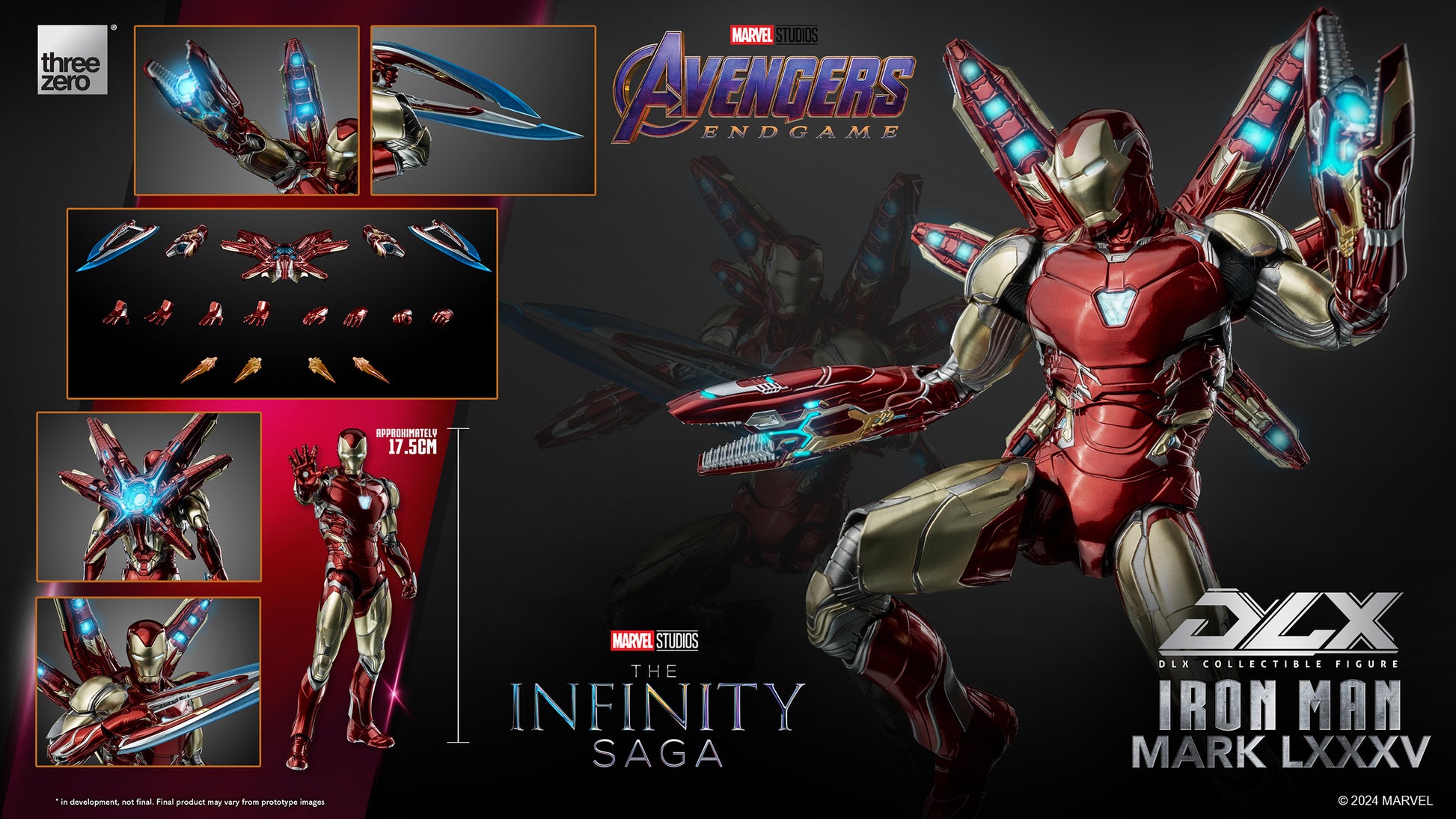 threezero and Marvel Studios are thrilled to present the DLX Iron Man Mark 85 Collectible Figure as the next Marvel action figure in the Marvel DLX series—the final and ultimate armor that made its appearance in Avengers: Endgame! The Mark 85 armor showcases a shimmering red and gold color scheme with a multi-layer metallic coating process applied to accurately replicate the design of Tony Stark's enhanced, exceptionally powerful suit!