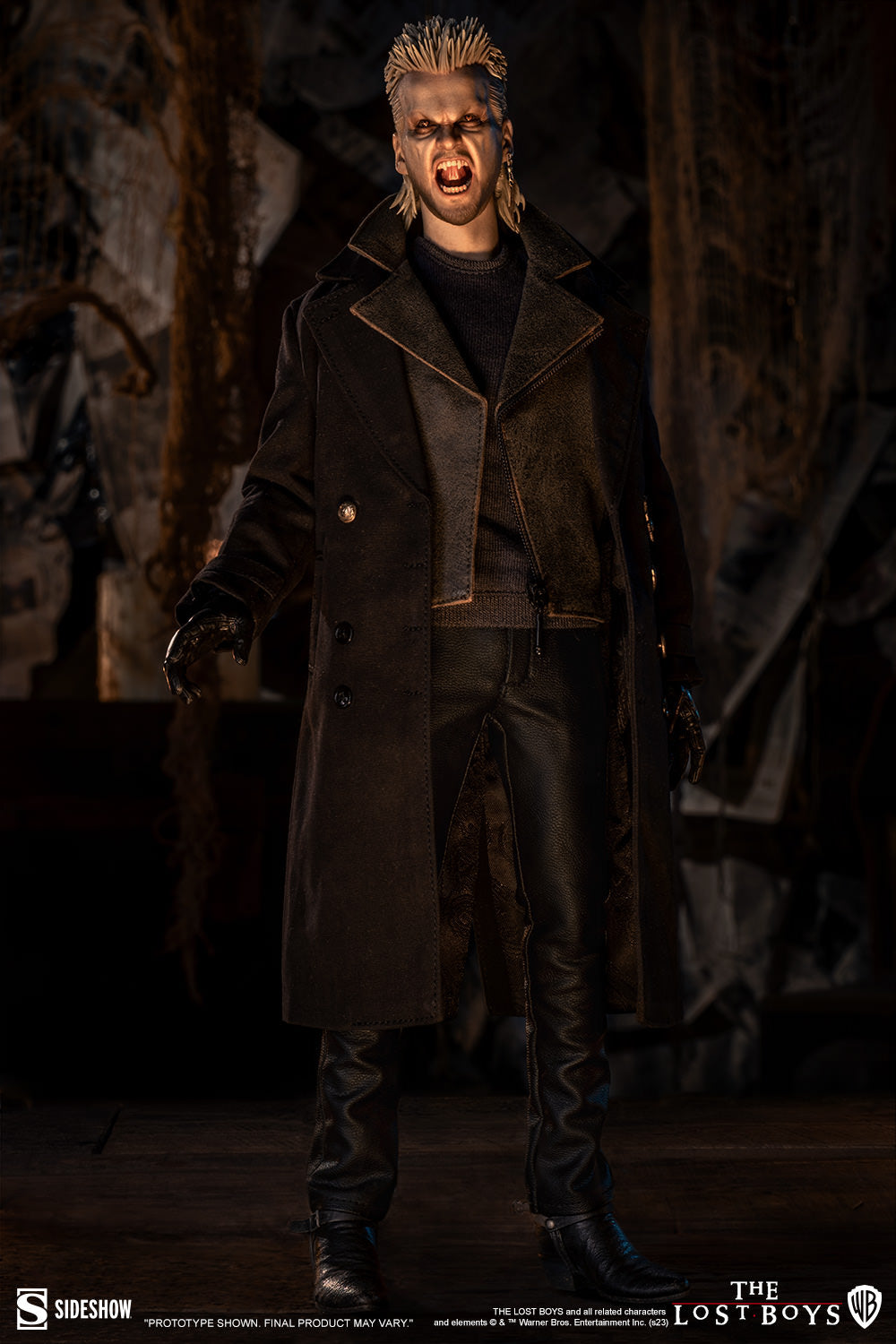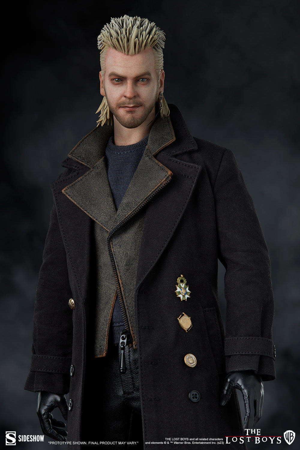 The David Sixth Scale Figure is a mixed media collectible featuring a faithful likeness of actor Kiefer Sutherland and a custom-tailored, movie-accurate fabric costume. His outfit is layered with an undershirt, a faux-leather jacket, an overcoat with decorative medals and buttons, and faux-leather pants. David comes with both a neutral portrait and a fanged vampire portrait, each detailed with his feathered earring and his sculpted hair styled in a textured blonde mullet.