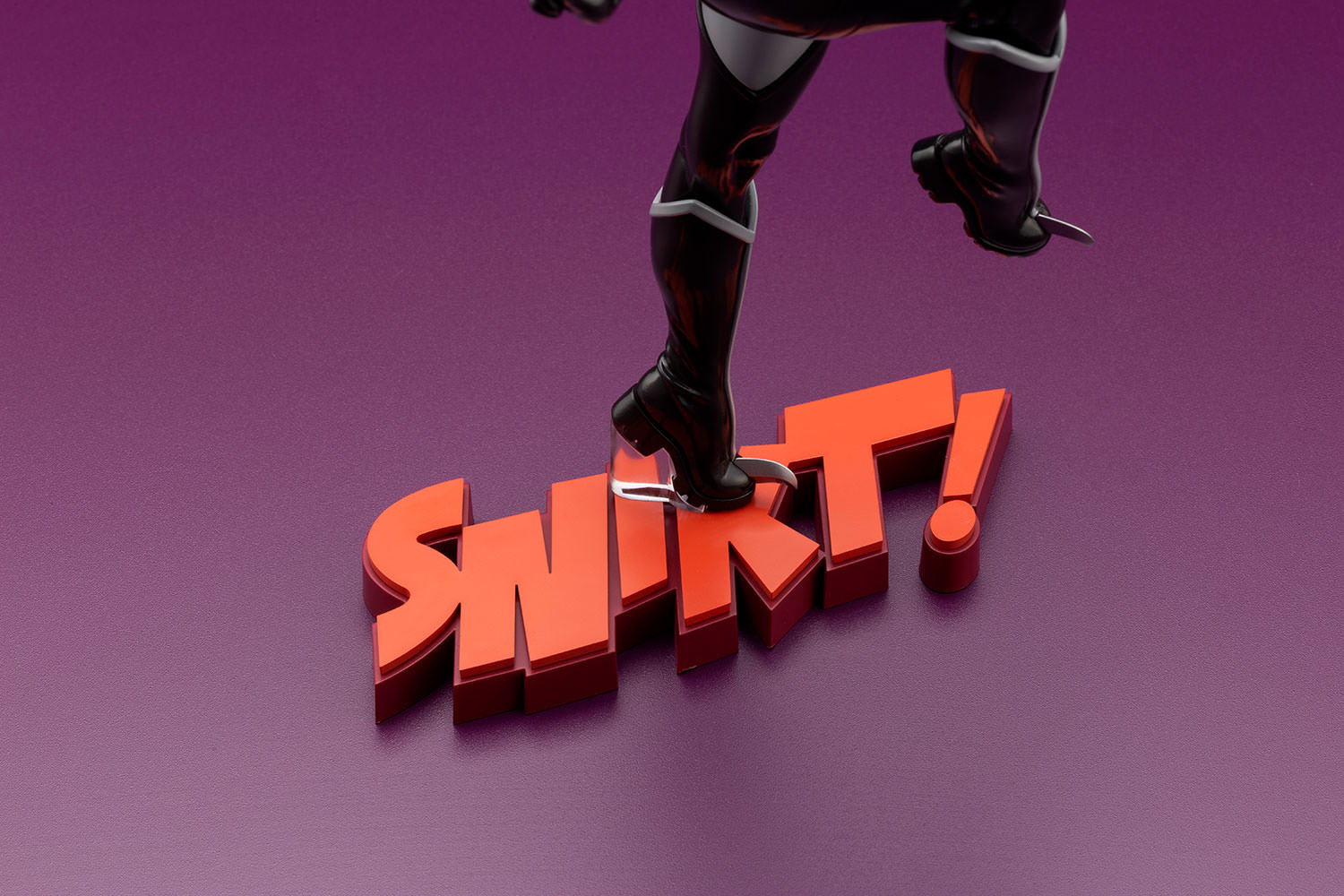 Her toned physique and full-bodied battle pose created by Tsubame are kept the same, while the costume this time uses black and gray as its base tones with the mask now in red.